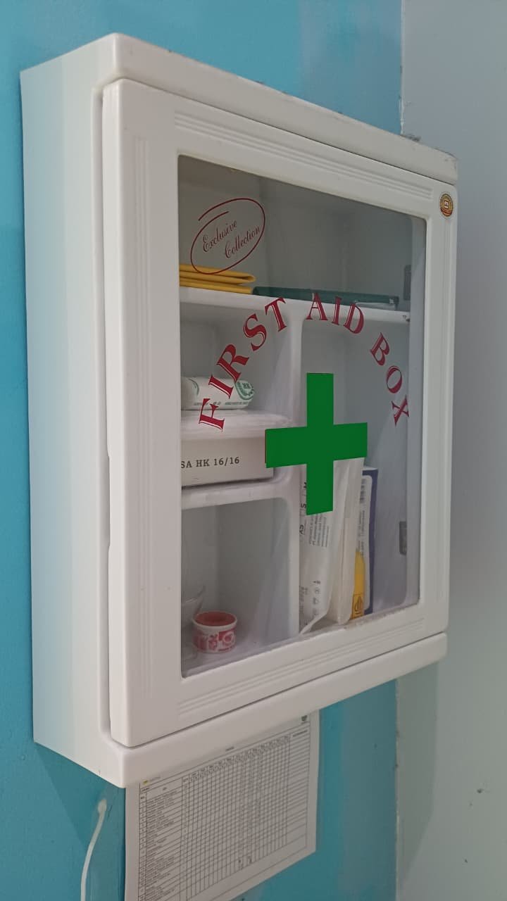 Kotak Pertolongan Pertama Pada Kecelakaan (P3K) yang disediakan dilengkapi dengan berbagai perlengkapan dasar medis, antara lain betadine, alkohol pembersih luka, perban, kasa steril, minyak kayu putih, serta obat-obatan ringan lainnya yang dapat digunakan untuk penanganan luka atau gangguan kesehatan ringan di tempat kerja. Setiap kotak P3K ditempatkan di lokasi yang mudah dijangkau, sehingga memudahkan siapa pun untuk menggunakannya ketika dibutuhkan dengan cepat dan tepat.